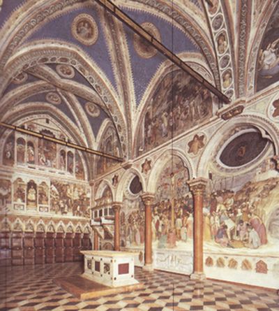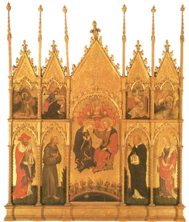 Dove era collocato?Dal Trecento grandiosi polittici dipinti, scolpiti e dorati impreziosirono gli altari delle cappelle private di mercanti, borghesi ma anche di confraternite e corporazioni, conventi e ordini. Quali erano i soggetti?Il riquadro centrale dava generalmente il titolo all’opera e la scelta dei soggetti devozionali si ripeteva spesso: Annunciazione, Natività, Crocifissione, Madonna col Bambino. Gli spazi laterali ospitavano le figure dei santi o le rappresentazioni delle storie sacre. La frequente presenza di evangelisti, apostoli, Padri della Chiesa aveva l’intento di sottolineare l’auctoritas della Chiesa e dei testi sacri. |