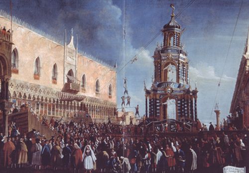 Gli edifici occasionali più singolari sono le “macchine” per i fuochi artificiali che, progettate da architetti e scenografi famosi, si costruivano annualmente in Piazzetta San Marco per celebrare la Festa del giovedì grasso. Il Carnevale veneziano, divenuto famoso per la quantità dei divertimenti che lo animavano, attirò molti viaggiatori da tutta Europa. |