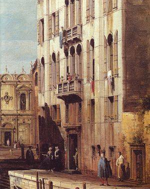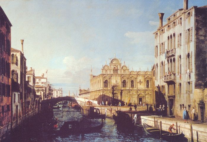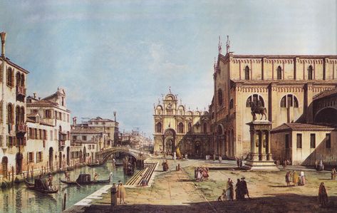L’operaProveniente dalla collezione Manfrin di Venezia, il dipinto appartiene alla produzione giovanile dell’artista che negli stessi anni ne produsse una variante più ampia. Proprio a quest'opera, inizialmente attribuita a Canaletto, probabilmente alludeva Ruskin quando, dipingendo il luogo dal medesimo punto di vista, si poneva in antagonismo con l'artista veneziano. La composizioneIl pittore, pur operando come lo zio, se ne discosta per il segno incisivo e per un realismo nitido, oggettivo. La dilatazione accentuata dei rapporti proporzionali e prospettici, nonché le forti contrapposizioni luminose, attribuiscono alla veduta una tensione drammatica espressa dalle macchie scure delle barche sul canale e dalle ombre profonde e nette. L’atmosfera cristallina esalta i dettagli delle architetture e le persone, ritratte fra luci e ombre, sembrano scandire il tempo degli incontri e della solitudine. A destra il seicentesco palazzo nasconde il monumento al Colleoni e lascia intravedere uno spigolo della chiesa dei Santi Giovanni e Paolo. Oltre la facciata della Scuola di San Marco si ha uno scorcio della chiesa di San Lazzaro dei Mendicanti e sullo sfondo, come ripresi con un teleobiettivo, si stagliano nel limpido cielo il campanile e la cupola di San Michele. |