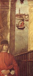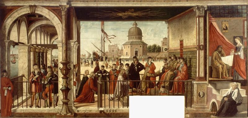 La composizioneIl telero presenta, scanditi da elementi architettonici, i diversi momenti della narrazione: l’arrivo degli ambasciatori alla corte di Bretagna, la presentazione della proposta di matrimonio del principe inglese, la camera dove Orsola pone al padre le proprie condizioni per acconsentire alle nozze. Carpaccio firma il telero nel foglio dipinto in basso dove si legge: OP. VICTORIS / CARPATIO / VENETI, e ambienta la storia in una Venezia sognata, trasfigurata dove architetture reali si accostano a edifici immaginari come il tempio posto al centro della prospettiva. Sul fondo della laguna si intravedono la fortificazione, che ricorda la Punta della Dogana come si presentava prima della trasformazione seicentesca, e l’isola di San Giorgio. La complessa rappresentazione "teatrale" presenta una moltitudine di personaggi vestiti secondo la moda del tempo, a questi appartiene l’uomo collocato a sinistra, davanti alla balaustra che delimita la scena. Egli, a confermare il carattere di “rappresentazione” dell’immagine, interpreta la figura del "festarolo", colui che nel teatro rinascimentale entra in relazione con il pubblico commentando i momenti salienti della storia. Analogo è il ruolo interpretato dall’anziana nutrice di Orsola che, seduta ai piedi della scala, attende di entrare in scena e raggiungere la principessa nella stanza descritta con accuratezza da Carpaccio. |