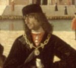 - Il giovane, posto di fianco, indossa aderenti calze di panno, un corto giubbetto detto farsetto che lascia uscire dalle fenditure delle maniche gli sbuffi della camicia e un berretto di panno con ricami, inoltre regge un falcone che lo identifica come cavaliere.