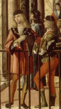 - Il ragazzo accanto indossa un giubbone rosa foderato di nero e calze di colore diverso, tipico costume degli appartenenti alle Compagnie della Calza: società costituite da giovani nobili occupati ad organizzare feste, rappresentazioni e talvolta impegnati ad accogliere le ambasciate straniere.