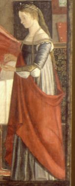 - Orsola indossa una lunga sopraveste azzurra con lo scollo trapunto di perle e le maniche staccabili aperte da fenditure per fare uscire lo sbuffo della camicia, segno di ricchezza. I capelli sono ornati di perle, simbolo di purezza.