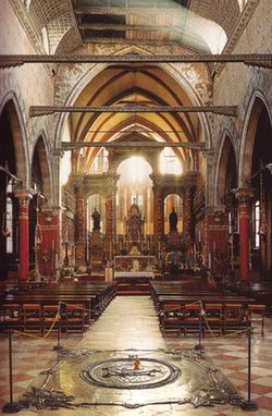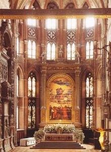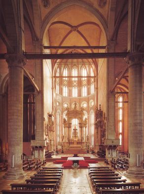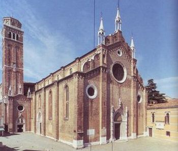 La grandiosa facciata in cotto, forata dal grande rosone e tripartita da lesene, si conclude a coronamento mistilineo ornato da edicolette. Il campanile, concluso nel 1396, è tra i più alti della città. La pianta è a croce latina, i robusti piloni, collegati da "catene" lignee, sorreggono gli arconi ogivali e separano le tre navate chiuse da volte a crociera. Al centro dell'immensa navata sorge l'intatto coro ligneo, costruito in forme gotico-fiorite nel 1468, e diviso in tre ordini con 124 posti. La luce scende, diffusa dalle splendide vetrate, a dar rilievo all'interno. Le due chiese coeve rappresentano i più prestigiosi esempi del gotico veneziano. |