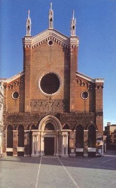 Definita il Pantheon della Serenissima per i numerosi sepolcri dogali posti al suo interno, la chiesa è lunga oltre cento metri e alta quasi quarantadue. Il verticalismo della grandiosa facciata, che riprende la struttura interna a tre navate, è sottolineato dalle edicole marmoree con statue e pinnacoli. L'assenza del campanile conferisce al volume della monumentale chiesa un peso proprio. L'imponente navata centrale, con volte a crociera, è sorretta da gigantesche colonne unite da tiranti lignei, che la separano dalle due navate laterali. L'accentuata verticalità dell'interno crea un effetto di "immenso", cui si aggiunge l'eccezionale trasparenza dell'abside maggiore, perforata in tutta la sua altezza da una sequenza di finestre e rosoni. La grande vetrata, dal vivace cromatismo, è uno dei pochi esemplari superstiti prodotti dalla scuola muranese tra il gotico e il primo rinascimento.
