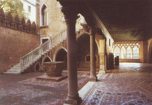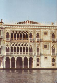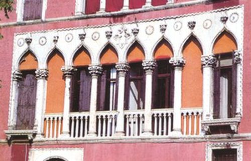 Abbiamo quindi uno spostamento cronologico rispetto al resto d’Italia, ma una volta rielaborato secondo le esigenze locali, il gotico” fiorito” perdurò nel territorio della Serenissima sino agli ultimi decenni del 1400, con esempi anche più tardi. E, mentre a Firenze il Brunelleschi completava la cupola di Santa Maria del Fiore simbolo del primo Rinascimento, nell'area marciana il gotico diventava la lingua dell’autocelebrazione aristocratica, e quel parlare “gentile” delle forme veniva adottato nei cantieri di Palazzo Ducale e della basilica. Fu dunque mescolandovi motivi orientali che l’arco gotico apparve a Venezia, legandosi poi in bifore, trifore, polifore. Le facciate dei palazzi si trasformano in un grandioso merletto di pietra e le masse murarie così alleggerite tendono a divenire un sottile confine di chiaroscuro tra la terra e l’acqua dove l’immagine si frantuma in mille riflessi. Questo gioco coloristico viene amplificato dall’impiego di vari materiali costruttivi: al laterizio si affianca la pietra d’Istria e poi il marmo. |