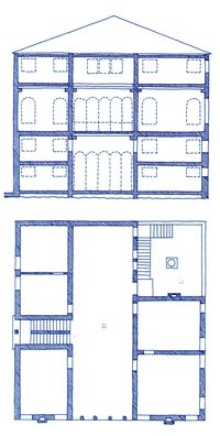 Tipologia costruttivaIl palazzo gotico mantiene la struttura della casa-fondaco, residenza e azienda del mercante, e presenta due ingressi: quello dall’acqua per le merci, l’altro da terra che immette in una corte con scalone esterno e pozzo centrale per la distribuzione dell’acqua piovana. All’ampio atrio, su cui si affacciano i magazzini, corrisponde il piano nobile “portego”, ambiente di rappresentanza, sul quale si aprono le stanze dell’abitazione. Il sottotetto è ad uso di dipendenti e servitori e le due ali al fianco dell’androne, se divise a metà in altezza, creano un ammezzato, sede degli uffici del mercante. |