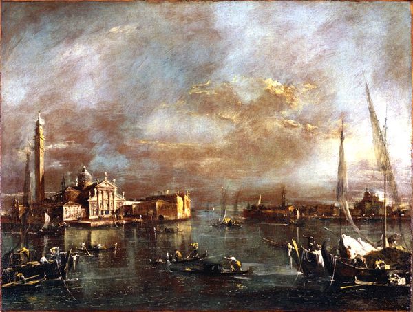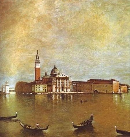 L’operaIl dipinto, più volte riprodotto dall’artista, fino al 1882 figurava nella collezione parigina di M. A. Febre, nel 1903 fu donato alle Gallerie dal principe Giovanni di Liechtenstein. La composizioneL’impostazione spaziale, derivata da Canaletto, evidenzia un diverso tono sentimentale espresso nell’argenteo cielo solcato da minacciose nuvole. Sull’acqua scura della laguna, “accesa” da pochi e sapienti tocchi di giallo, scivolano lente le gondole e le barche dalle vele sfrangiate. Il pittore firma l’opera ponendo le iniziali F.G. sulla cassa in basso a destra. La stesura rapida ed essenziale non delinea i contorni delle architetture che sembrano perdere consistenza, quasi fossero corrose dall’intensa vibrazione luminosa. I suoi gondolieri, guardati da vicino, sono macchie di puro colore steso con rapidi tratti, ma allontanandosi l’illusione si ricrea e le figure si animano. L’atmosfera, carica di un silenzio introspettivo, sembra presagire l’imminente declino della millenaria Repubblica. A sinistra l’isola di San Giorgio presenta ancora il vecchio campanile crollato nel 1774; a destra la Giudecca, con la chiesa di San Giovanni Battista, successivamente distrutta, e la chiesa delle Zitelle. |