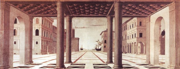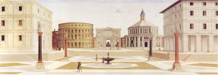 Nel Quattrocento l’umanesimo si sviluppa come civiltà prevalentemente urbana e lo studio di un luogo di convivenza civile, armonioso e attivo, appassiona pittori e architetti. Gli studi di urbanistica occupano un posto centrale nel dibattito intellettuale che si esprime nei Trattati dove viene sviluppato il tema della città ideale. Se l’uomo, come nel mondo antico, torna ad essere misura di tutte le cose così la città in cui vive si deve rapportare a lui in modo armonico. In questo clima, al gusto della scoperta si affianca la necessità di fissare regole verificabili su basi geometriche, e si assiste a una decisa ripresa dei motivi classici caratterizzati da armoniose proporzioni.