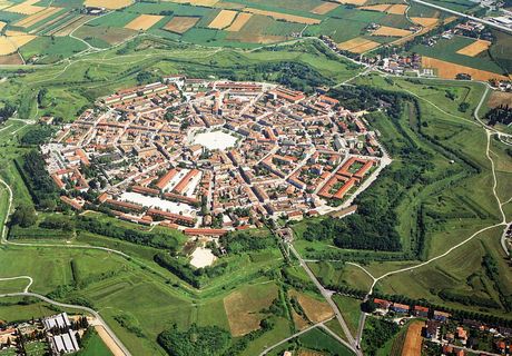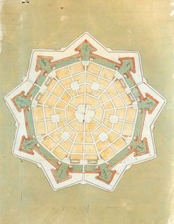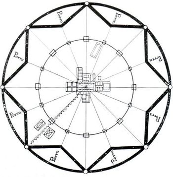 Il disegno di Sforzinda si trova nel libro II del Trattato di Architettura, composto per Francesco Sforza, signore di Milano. La città, mai edificata, presenta un perimetro fortificato a impianto stellare, risultato di due quadrati ruotati di 45° l’uno rispetto all’altro. Sulle otto punte della stella sono collocate torri cilindriche collegate da una muratura circolare. Un ulteriore cerchio, concentrico al primo, si ripete all’interno e racchiude gli edifici della città. Le strade convergono al centro. La pianta del Filarete ispirerà la realizzazione nel Seicento della friulana Palmanova. |