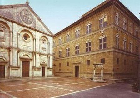 Nel 1459 papa Pio II, appartenente all’antica casata senese dei Piccolomini, incarica l’architetto Bernardo Rossellino di trasformare il suo borgo natale in una città ideale, ribattezzata con il nome di Pienza. Il progetto, che rimane incompiuto per la morte del pontefice nel 1464, si realizza nella piazza dove Rossellino rinnova gli edifici già esistenti ed edifica sullo sfondo una nuova cattedrale e accanto il palazzo Piccolomini. L’adozione di rigorosi principi geometrici nonché di elementi architettonici classici conferisce omogeneità agli edifici che riecheggiano le architetture di Leon Battista Alberti. L’architetto inoltre, per esaltare la facciata della cattedrale, traduce nello spazio reale i principi della prospettiva lineare: la piazza, dalla forma trapezoidale, ha una pavimentazione a spina di pesce percorsa da una griglia geometrica in bianco travertino che sottolinea il percorso delle ortogonali convergenti verso un unico punto di fuga.