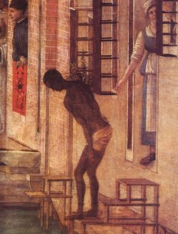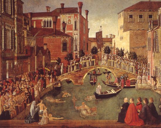 Gentile ci restituisce esattamente l’immagine della Venezia quattrocentesca, uno dei centri europei a maggiore densità abitativa e la presenza del giovane africano rispecchia la realtà umana composita della società veneziana. La scena è affollata di personaggi, staticamente assiepati per assistere al miracoloso ritrovamento della reliquia caduta in acqua. A sinistra viene ritratta Caterina Cornaro e nel gruppo, inginocchiato a destra, la tradizione riconosce i membri della famiglia Bellini. Il pittore ritrae con precisione estrema un caratteristico angolo della città, ancora esistente e in parte riconoscibile. Nel dipinto i palazzi, dai caratteristici comignoli e dalle finestre gotiche con ante di legno, sono decorati da pitture. Un tempo l'uso di affrescare l'esterno dei palazzi era assai diffuso e l'impressione offerta dalla città doveva essere davvero stupefacente.