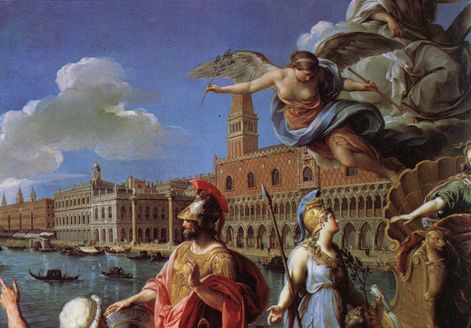 L'incisione di Andrea Zucchi su disegno di Silvestro Maniaco riprende il tondo che Jacopo Tintoretto affrescò nel 1577 per il soffitto della Sala delle Quattro Porte di Palazzo Ducale, raffigurando Giunone che conferisce a Venezia potere e nobiltà insieme ad altri doni, ad esaltazione delle origini divine della città, il suo saggio governo e il suo potere esteso anche ai domini sulla terraferma. |