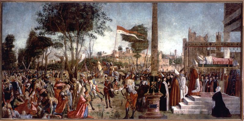 Le esequie della santa hanno luogo nel tempo e nello spazio dell’attualità veneziana e al corteo funebre partecipano vescovi, autorità cittadine e confratelli della Scuola. Probabilmente la devota inginocchiata in preghiera era Orsola, la moglie di Antonio Loredan che nel 1474 difese con eroismo Scutari dall’assedio turco.
