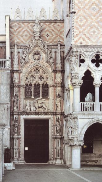 La Porta della Carta, commissionata dal doge Foscari, appare ispirata al balcone del Maggior Consiglio. Splendido esempio di gotico fiorito, fu realizzata dopo il 1438 da Giovanni e Bartolomeo Bon, entrambi scultori e architetti. Lo scenografico accesso al palazzo, che inquadra la scala maggiore, fungerà da fondale alle solenni uscite del doge la cui immagine, inginocchiata al cospetto del leone marciano, campeggia sull’architrave. L’apparato scultoreo presenta le virtù – Temperanza, Carità, Fortezza, Fede – poste nelle nicchie, il busto di san Marco e, a coronamento, la Giustizia che originariamente si innalzava nel cielo. |