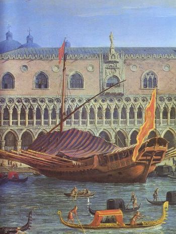 All'inizio del 1400, per dare fama e onore allo stato e alla città, si inizia il monumentale balcone che si affaccia dalla sala del Maggior Consiglio verso il mare. Qui, Pierpaolo di Jacobello delle Masegne, dopo aver inquadrato con una coppia di colonnine binate l'ampio finestrone archiacuto, già aperto, lo rinserra fra due coppie di altissimi pileri che, articolati da edicole con statue di santi e di virtù, si elevano fin oltre il coronamento della facciata. Nel riquadro parietale al di sopra dell'oculo colloca l'immagine del doge genuflesso al cospetto del leone marciano, in segno di sottomissione all'autorità delle leggi. E, infine, corona la composizione con un alto baldacchino lapideo nelle cui nicchie stanno san Marco, protettore della città, e i santi Pietro e Paolo, governo e pensiero della cristianità. I santi che affiancano l'ampio poggiolo di marmo rosso veronese sono Giorgio e Teodoro, l'uno guerriero l'altro bizantino, la cui devozione assai popolare in Venezia si rinvigorirà nel Quattrocento. Le virtù, cardinali e teologali, accompagnano il governo del principe. Ecco come la "finestra granda indorada" rivela il suo significato: Venezia muro di fede contro i Turchi e gli infedeli, Venezia in cui le leggi sono sovrane. Non per caso il policromo e prezioso apparato del balcone si affaccia al bacino: il messaggio di autorità e di sacralità è rivolto alla piazza "da mar", là dove le colonne di Marco e Teodoro annunciano l'approdo alla trionfante città. |