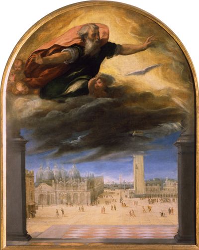 La scenografica rappresentazione a volo d’uccello offre una dettagliata veduta della piazza dove la vita si svolge serena nonostante le minacciose nubi che la sovrastano. La “divina” città è protetta dall’Eterno che si preoccupa di scacciare l’incombente pericolo. Il pittore, collocando la casa della Vergine Maria nell’area marciana, riprende e sottolinea la leggenda della fondazione di Venezia voluta il 25 marzo, giorno dell’Annunciazione. Come un “moderno” vedutista, l’artista descrive momenti di vita quotidiana e la piazza si anima di personaggi che vi si incontrano o vi svolgono attività varie. Osserviamo i postulanti davanti alla Porta della Carta, un gruppo di saltimbanchi vicino al campanile con la Loggetta già ultimata, i portabagagli e, in primo piano a sinistra, la bottega di pellicciai. L’evento miracoloso non interferisce con lo scorrere della vita cittadina.