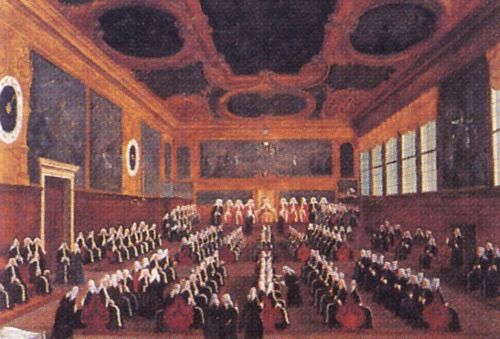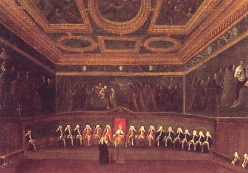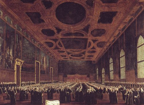 La gestione assembleare degli affari caratterizza Venezia come la prima repubblica parlamentare. “Se non raggiunge la perfezione, rappresenta perlomeno uno dei migliori risultati conseguiti da una collettività nel tentativo di darsi una costituzione equilibrata e durevole” dove si evidenzia “[…] la superiorità della collettività sull’individualità, del pubblico sul particolare. […] Acutamente, uno studioso, R. Guerdan, ha scritto che il motto della Serenissima avrebbe potuto essere quello della repubblica francese con una sola rettifica centrale: Liberté, Legalité, Fraternité […]” . (Zorzi 2005, pagg 23, 60, 101) |