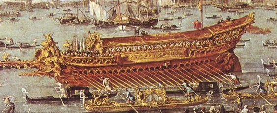 Poi, la galera fu spinta a remi verso il mare aperto, e là, assistiti dal Patriarca, essi sposarono il mare con un anello. La formula per lo sposalizio suonava così: “In signum veri perpetuique Domini”. E a quel punto il Doge lasciò cadere in mare l’anello; ma sarebbe troppo lungo riferire tutta la procedura della cerimonia.