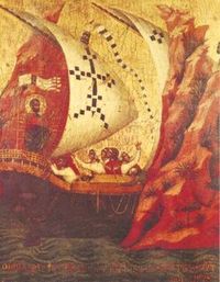 La leggenda veneta narra che, prima di lasciare Aquileia per recarsi ad Alessandria d’Egitto, un angelo apparve a Marco annunciandogli che le sua ossa avrebbero riposato nell’isola di Rialto. Dal 979 si proclama il doge «patronus et verum gubernator capelle sancti Marci» e nel culto del santo i valori religiosi e civici diventano inseparabili. Venezia s'ingrandisce e si fortifica contro le incursioni piratesche, il castello, cuore della città, era circondato da mura e da torri. Fattasi sempre più potente sul mare e strappate agevolazioni all'impero bizantino per gli aiuti prestati, Venezia tende a rafforzare le posizioni di preminenza nell'Adriatico su tutte le popolazioni rivierasche in modo da assicurarsi la via libera verso l'Oriente. |