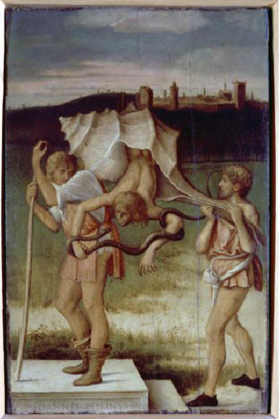 La scena ci presenta due uomini in primo piano, vestiti poveramente, che trasportano a fatica un’enorme conchiglia; il primo, mentre sta salendo dei gradini, si sostiene con un lungo bastone e volge la testa indietro, il secondo è tutto intento nel suo compito e mostra uno sguardo stupito, quasi spaventato. Dalla conchiglia, che attira subito inevitabilmente la nostra attenzione, esce per metà un altro uomo, nudo, magro, con i capelli arruffati e la lingua fuori dalla bocca. La sua posizione è inquietante perché ha le braccia avvolte trattenute da un lungo serpente dalla lingua biforcuta che affronta il volto dell’uomo e lo acceca. Sullo sfondo si delinea, con precisione di particolari, il perimetro delle mura di un’ideale città fortificata.